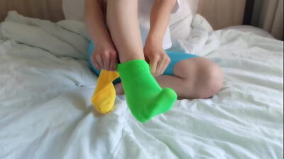 Her brightly colored mismatched socks are perfect for a sensual Sockjob